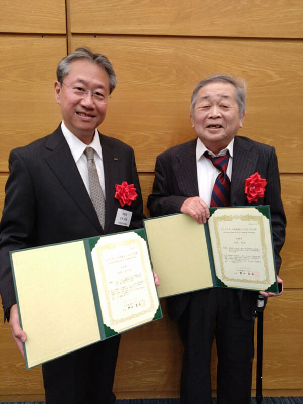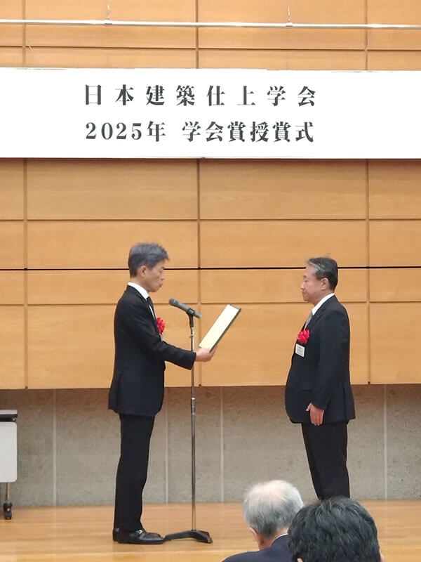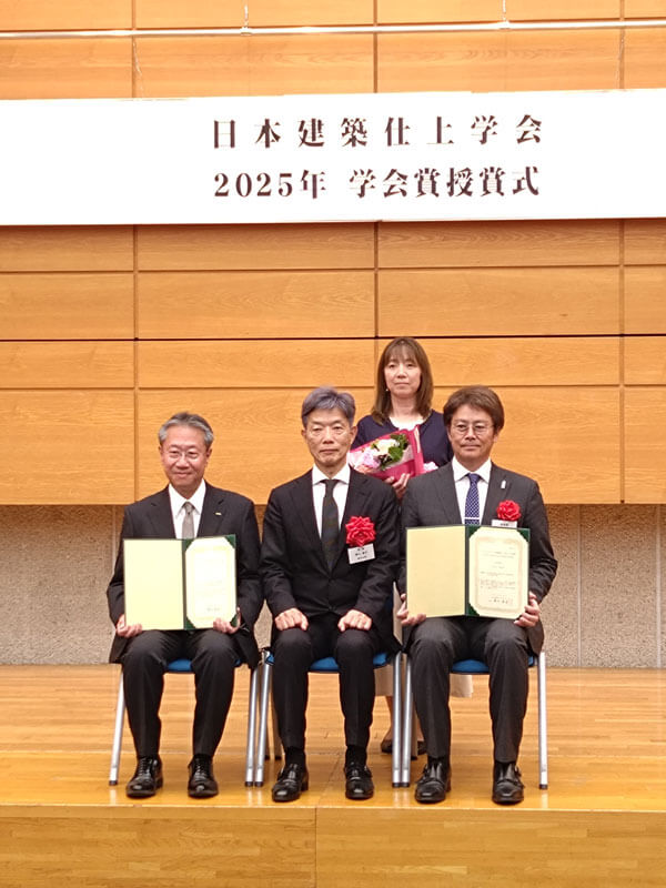 上でお名前を上げさせていただいた大澤悟先生(右上の写真の右側)も学会で永く総務委員長を務めたことなどより、「建築用仕上材料・部材の研究開発及び成果の普及並びに関連学協会・団体との学術活動に関する功績」として、今回功績賞を受賞されました。
