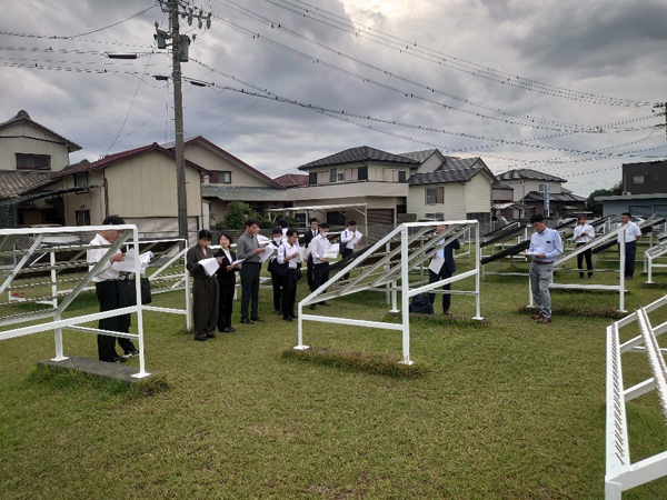 バス移動中にはアルミニウム合金の種類とリサイクルのための種類分別の必要性を説明しましたが、見学の遅れもあり、暴露試験場の到着は当初の予定より30分遅れて到着しました。暴露試験場ではDNT渡部市場開発部特命部長、町野埼玉営業所長、岡本静岡営業所長のお三方に説明を受けました。あいにく、昨年まで当工業会から日本建築仕上学会に委託研究をしておりました『促進耐候性評価』の試験体は撤去されておりましたが、その他の試験体を基に暴露試験場のあり方やその意義などをご説明頂き夕闇が迫る中、暴露試験場をあとにしました。