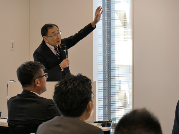 2本目のご講演は、昨年9月にも福岡で講師を受けてくださった石井氏(当時関西ペイント㈱日本汎用事業部門工業塗料本部市場開発G部長で講演時はカンペ商事取締役執行役員)が前回の講演内容の進化版として「ESGと脱炭素~持続可能な環境貢献と事業成長~Part2」をご披露頂きました。講演では日本を取り巻いている国際的な外部環境の話を前回にプラスαしてご説明頂いた上で、少しずつ明らかになった日本版のSDGsと脱炭素の規制やGXリーグなど官民一体の取り組みなどを教えていただきました。日本を代表する有名な優良な大企業法人でさえ、もしいま議論されている通りに法案が可決すれば赤字に転落する程のインパクトがあるといわれる税負担を含む法規制がこれからいよいよ具体化されていきます。我々中小企業も対岸の火事ではなく、自分のこととして今のうちから中期的に取り組む必要性を感じました。また講演終盤には関ペさんの環境対応の塗料の紹介がありました。質疑応答の時間でもかなりの時間、環境対応塗料に関する具体的な質問などに割かれていましたことは、聴講者の高い関心の表れだと思います。